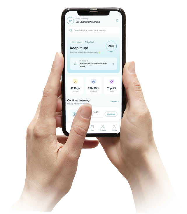 Everything in one place — video lectures, notes, QBank, flashcards, and AI planning.